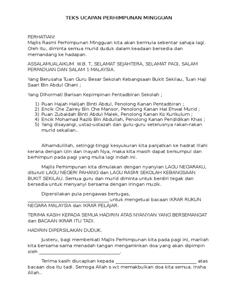 Kelas dan berjalan ke padang sekolah. Perhimpunan rasmi sekolah diadakan pada hari isnin,29 mac 2010.perhimpunan ini dijalankan di anjung maamor,sekolah. Teks pertandingan syarahan sjkc malim. Contoh karangan kepentingan perhimpunan mingguan rasmi. Pada setiap hari ahad, sekolah saya akan mengadakan perhimpunan pagi. Dalam era globlaisasi ini, perhimpunan rasmi sekolah sering diambil remeh oleh para pelajar. Tiga orang pengawas menaikkan bendera ketika . Semua murid dan guru berkumpul di dewan sekolah. Contoh karangan kepentingan perhimpunan rasmi sekolah. Dalam era globalisasi ini, perhimpunan mingguan sekolah sering dipandang remeh oleh para pelajar . Perhimpunan mingguan sekolah merupakan satu aktiviti yang lazimnya diadakan dengan menghimpunkan semua murid bersama guru di sesuatu tempat dalam sekolah.